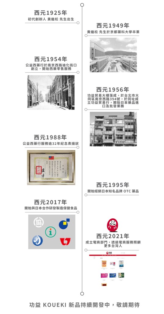 如今功益已傳承第三代,持續提供市民專業、優質的保健服務當年迪化街口的 公益西藥行 已都更拆遷但這超過一甲子不曾變過的是黃藥師的信念 - 守護國人健康
